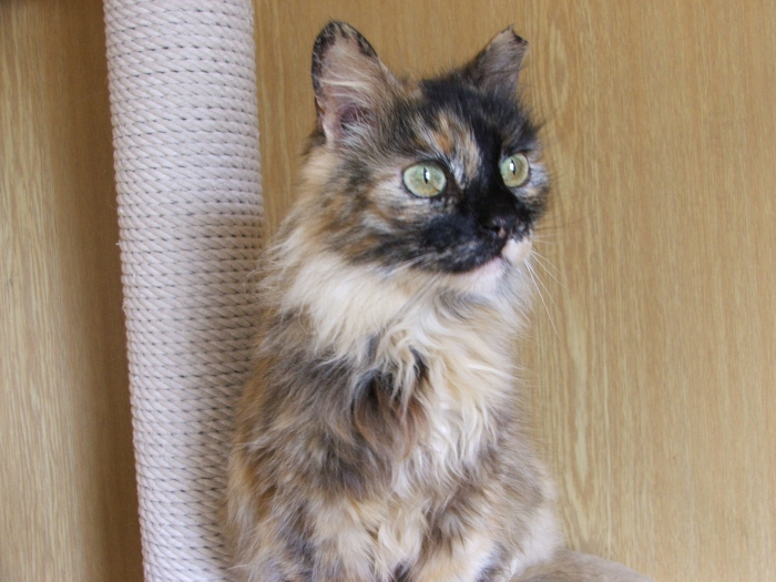 York is a very handsome tortoise male cat with longhair coat of extraordinary beauty. His coat pattern is soft sand tabby, he‘s got a cute rose nose, with one nostril adorned with a tawny streak. York has white gloves and white „bib“, and long white whiskers. York‘s eyes are almost same color as his coat – yellow with orange threads.
